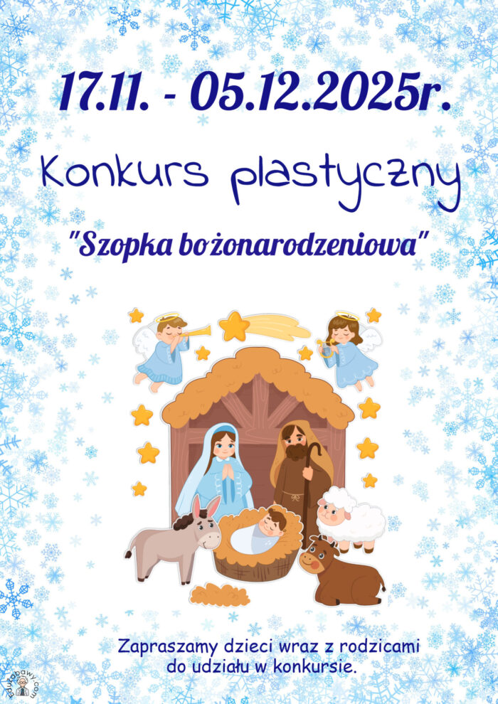 Serdecznie zapraszamy do wzięcia udziału w konkursie plastycznym “Szopka bożonarodzeniowa”. Prosimy o zapoznanie się z regulaminem konkursu.