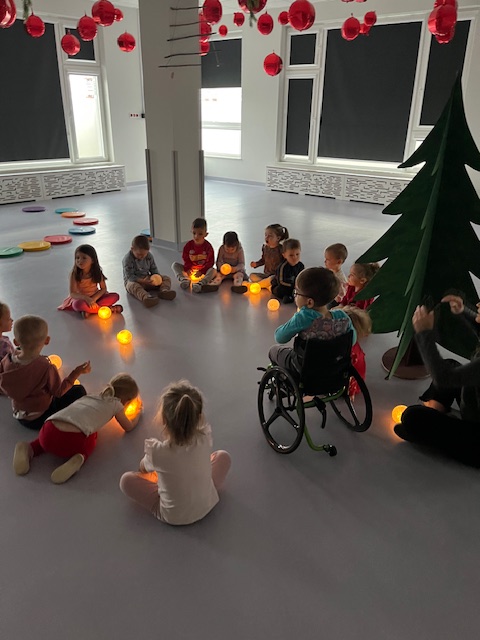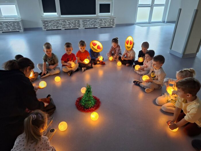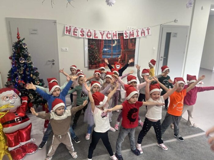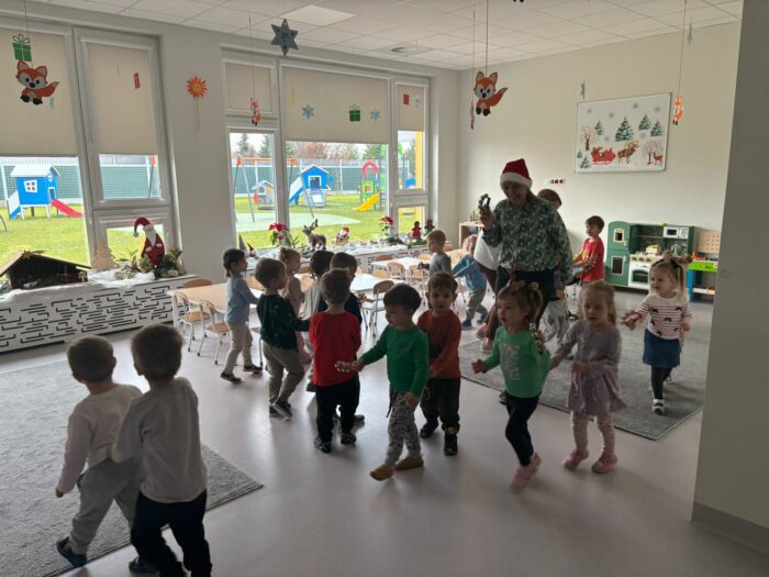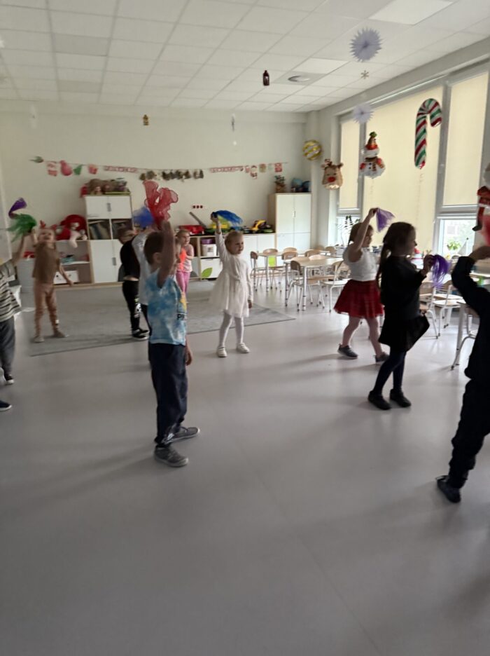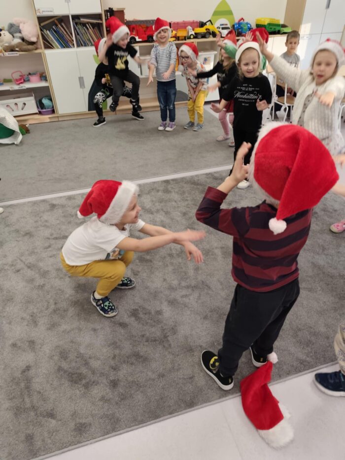 W ramach projektu „Muzyczne kroczki przedszkolaka” 16 grudnia dzieci podczas zajęć wykonały “Mikołajkowy taniec”. Małe stopy wybijały rytm szczęścia, a migające lampki na choince dodawały blasku zimowym tańcom. Przedszkolaki z wielką pasją rozwijały swoje umiejętności rytmiczne, udowadniając, że muzyka to najlepszy sposób na powitanie zimy. To był dzień pełen tanecznej energii! Poznane układy towarzyszyły nam w świątecznym okresie dodając uśmiechu w ten magiczny czas.