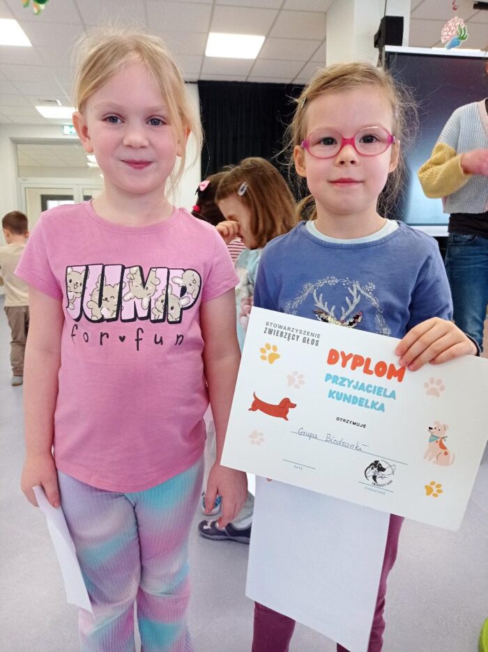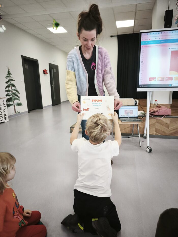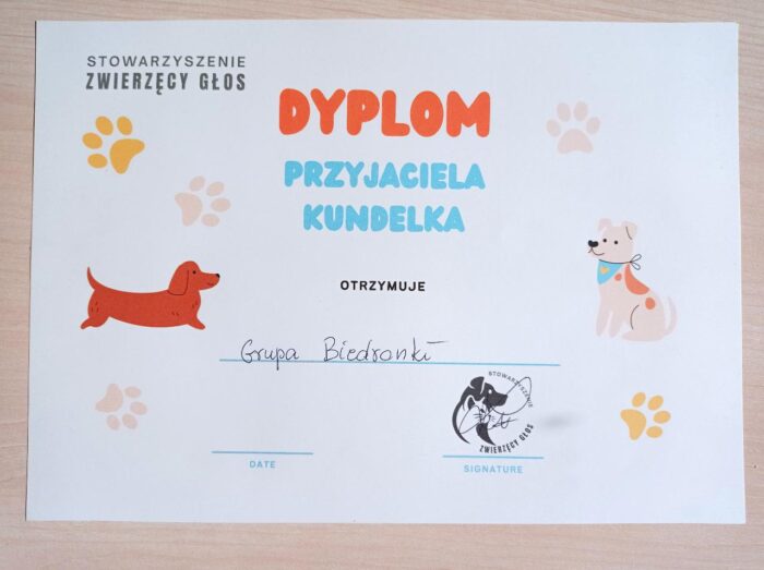 Na zakończenie każda grupa otrzymała pamiątkowy dyplom „Przyjaciela kundelka”. Spotkanie było nie tylko ciekawe, ale przede wszystkim bardzo pouczające – pomogło dzieciom lepiej zrozumieć potrzeby zwierząt oraz nauczyło je odpowiedzialnych i bezpiecznych zachowań.