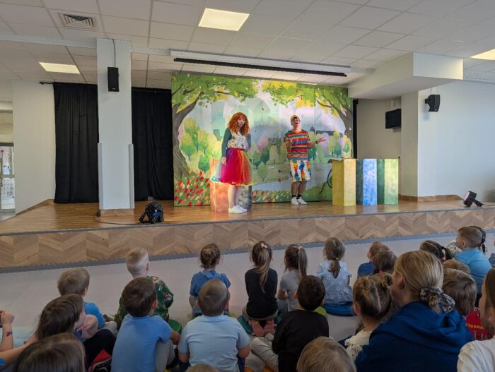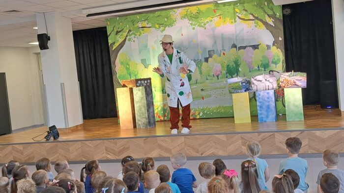 W czwartek nasze przedszkole odwiedził teatr Kwatera, który zaprezentował spektakl pt. „Hela i Piotruś sprzątają świat”. Przedstawienie opowiadało historię rodzeństwa, które wyrusza w niezwykłą podróż, by pomóc uratować naszą planetę. Dzieci razem z profesorem, który im towarzyszy, szukają rozwiązań, aby uchronić Ziemię przed zanieczyszczeniami. Naukowiec wyjaśnia, czym grozi zanieczyszczenie środowiska oraz w jaki sposób zadbać o otoczenie. Dzięki ciekawej fabule, humorowi i aktywnemu udziałowi przedszkolaki mogły w praktyczny sposób dowiedzieć się, jak dbać o środowisko, prawidłowo segregować odpady oraz podejmować świadome, ekologiczne decyzje każdego dnia.